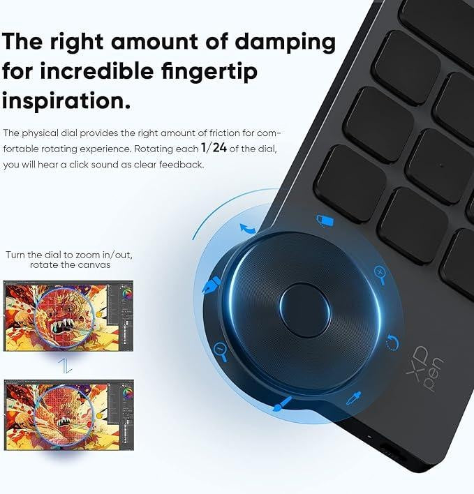 The physical dial provides the right amount of friction for a comfortable rotating experience. Rotating each 1/24 of the dial, you will hear a click sound as clear feedback. Turn the dial to zoom in/out, rotate the canvas, or adjust the brush size, and let your inspiration flow.
